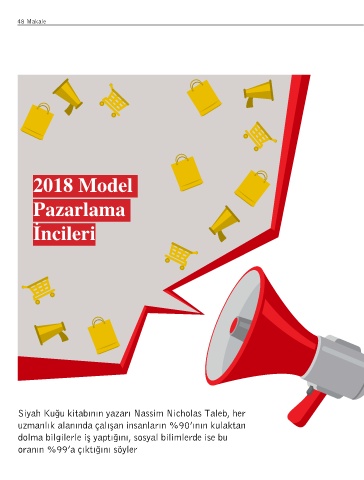 48 Makale 2018 Model Pazarlama İncileri Siyah Kuğu kitabının yazarı Nassim Nicholas Taleb, her uzmanlık alanında çalışan insanların %90’ının kulaktan dolma bilgilerle iş yaptığını, sosyal bilimlerde ise bu oranın %99’a çıktığını söyler